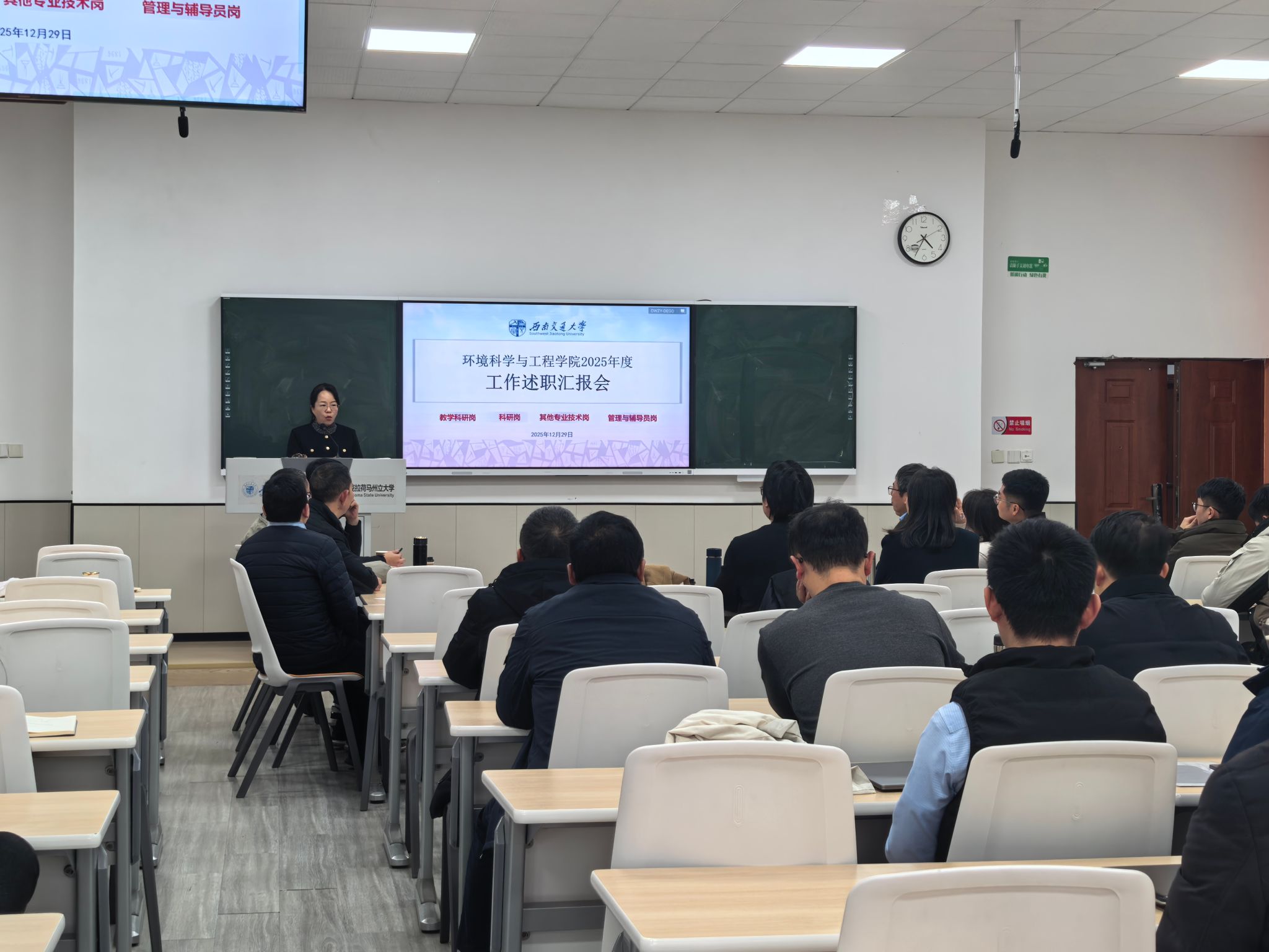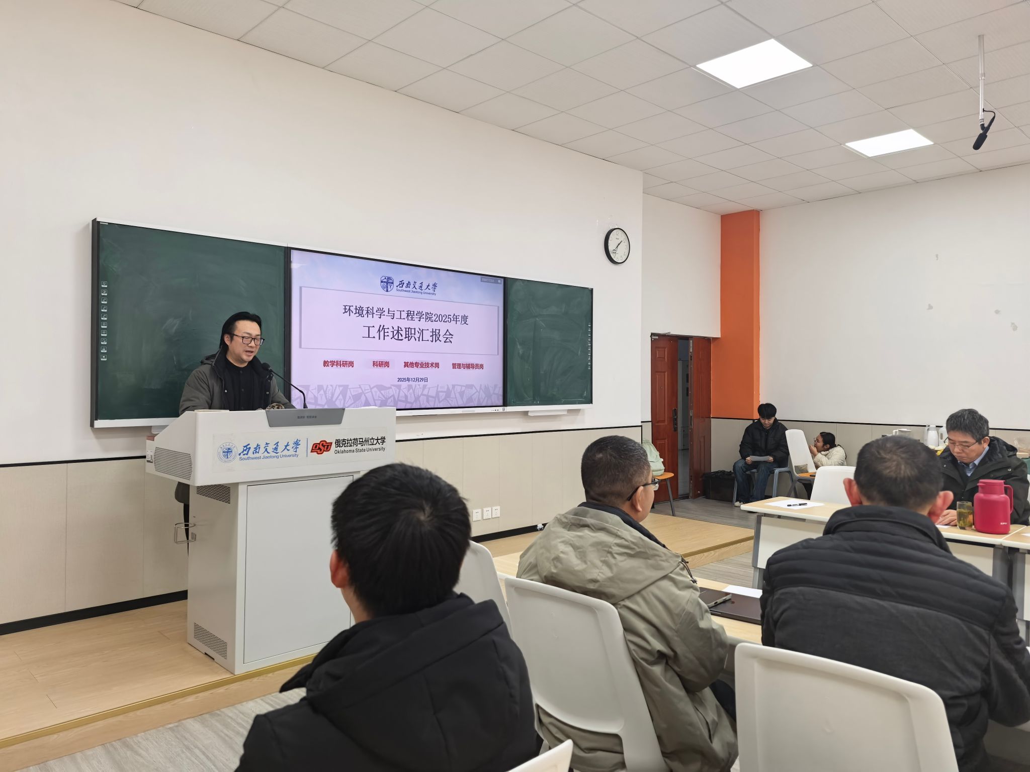 会上,全体教职工依次述职,聚焦教育教学、科研进展、公共服务三大板块,全面复盘全年工作成效。述职过程中,资深教师结合教学经验,分享了课堂管理的宝贵心得与学生反馈的优化思路;青年教师则围绕科研工作,畅谈实践感悟与职业思考,同时亮出新版专著高级别论文与项目等科研成果,展现出蓬勃向上的奋进姿态;行政管理与辅导员岗位聚焦专项工作与服务育人实效,系统梳理了师生服务保障、管理流程优化及学生成长支持等方面的创新举措与实际成效。
