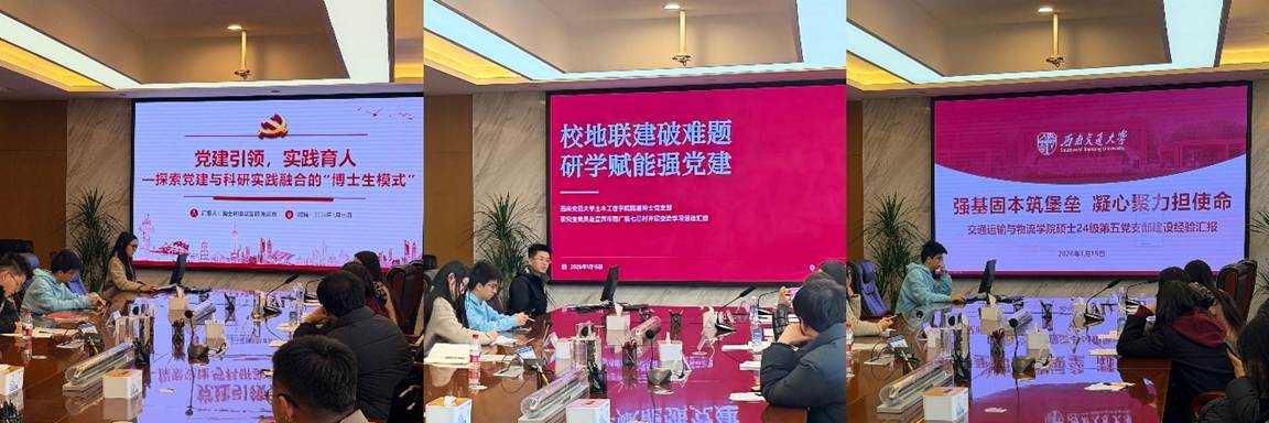 博士环境党支部书记朱欢欢聚焦“党建引领,实践育人:探索党建与科研融合的‘博士生模式’”,介绍了支部在推动党建与科研一线深度融合的实践探索;土木学院隧道博士党支部书记王晓波以“校地联建破难题,研学赋能强党建”为题,分享了深入乡村开展党建联学与红色教育的实践经验;交运学院硕士24级第五党支部组织委员丁怡围绕“强基固本筑堡垒 凝心聚力担使命”,阐述了以严格组织生活促进党建与学风建设协同并进的举措与成效。
