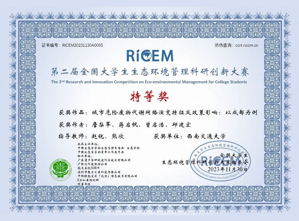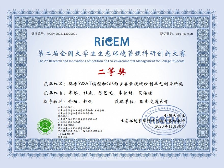 赵锐、俞阳、熊欣三位老师的指导下,共有3项参赛作品获奖。其中,赵锐、熊欣老师所指导的参赛作品《城市危险废物代谢网络演变特征及政策影响:以成都为例》荣获大赛特等奖,团队成员为詹梨苹、蒋启帆、曾启浩、邱建宏;由俞阳、赵锐老师所指导的参赛作品《耦合SWAT模型和GlS的多要素流域控制单元划分研究》以及《岷江与沱江流域碳排放效率时空演变特征分析及碳减排路》分别荣获大赛二等奖、三等奖,团队成员为牟琴、杜森、陈艺戈、李佳妍、夏洁滢。