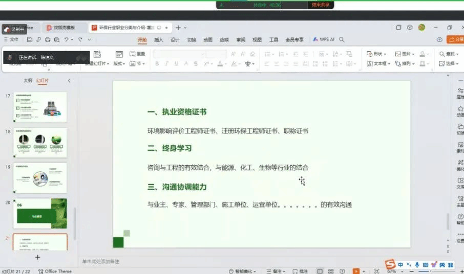 ,现就职于四川省生态环境科学研究院,任固体所副所长。尹朝阳学长从环境学科就业方向的角度出发,为同学们分析了各个职业选择的优势,帮助同学们梳理不同职业的工作内容和所需要的条件,分享他在就业时的经验和想法。他特别强调了同学们要发挥学习的主观能动性,培养终身学习的观念,主动积极学习行业最新的政策和方法,紧跟国家发展步伐,以此来提高职场竞争力。