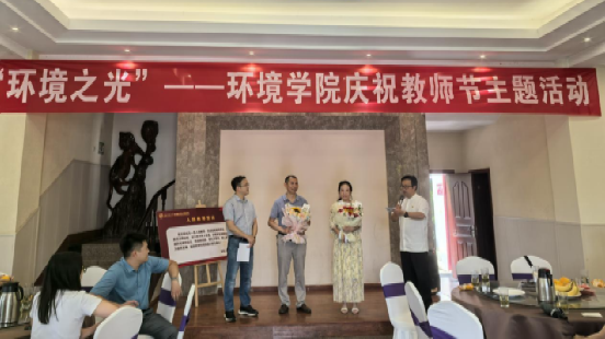 教师节活动仪式由学院工会主席彭道平主持。活动第一项是为光荣从教30年的教师代表献礼仪式。学院目前有退休教师15人,在职从教超过30年的教师5人。三十年的教育征程是一个辉煌的里程碑,镌刻着老师们对教育事业的忠诚、奉献和坚守。活动邀请了李启彬老师和王绍笳老师作为教师代表发言,并向他们献上了花束以示祝福。学院党委书记甘霖,代表龚正君院长,代表学院党政领导班子,向学院老教师们致以节日的问候。甘霖讲到,30年来,老师们爱岗敬业、无私奉献、不图名利、不计得失,倾尽丹心育桃李,奉献韶华铸师魂,把自己最美好的岁月奉献给了祖国的生态环境教育事业。祝老师们节日快乐,身体健康,工作顺利。