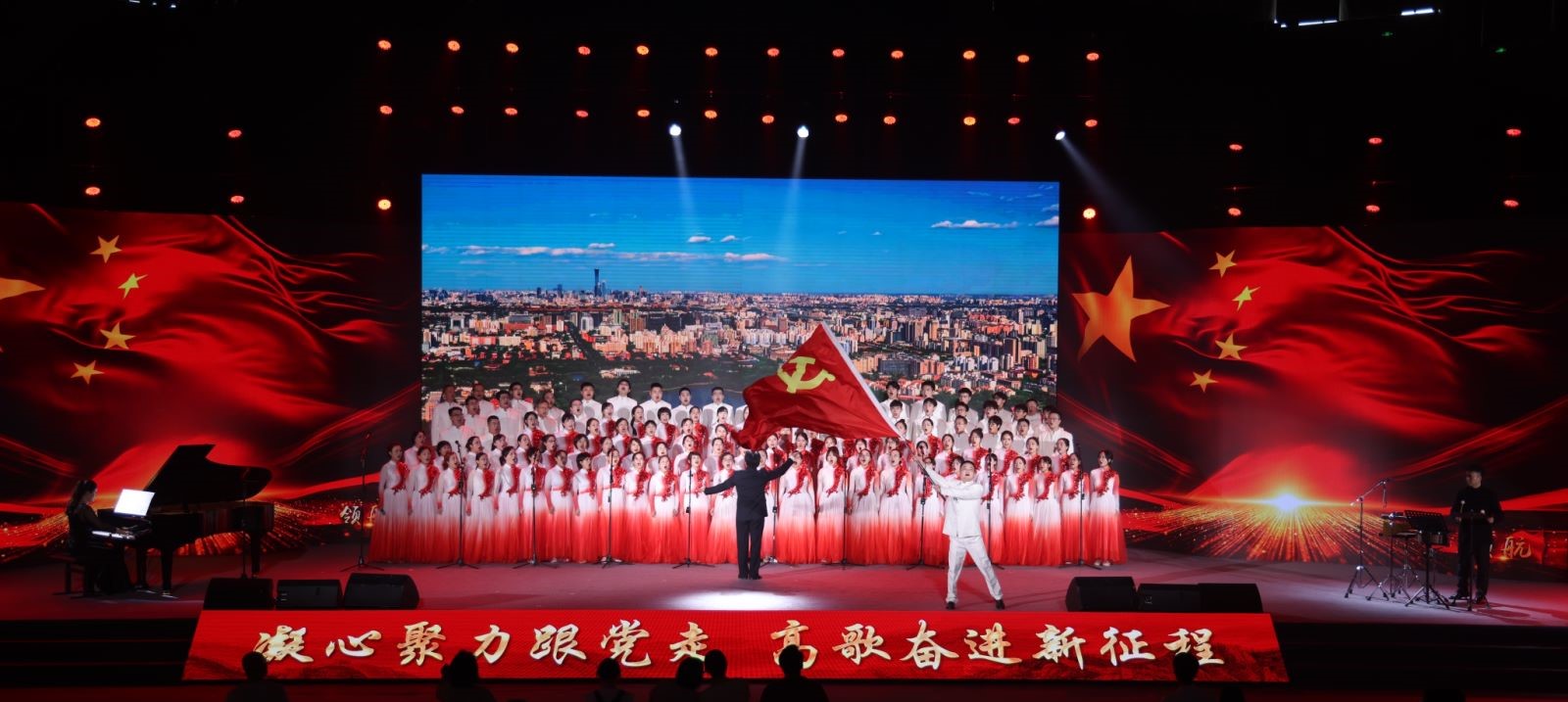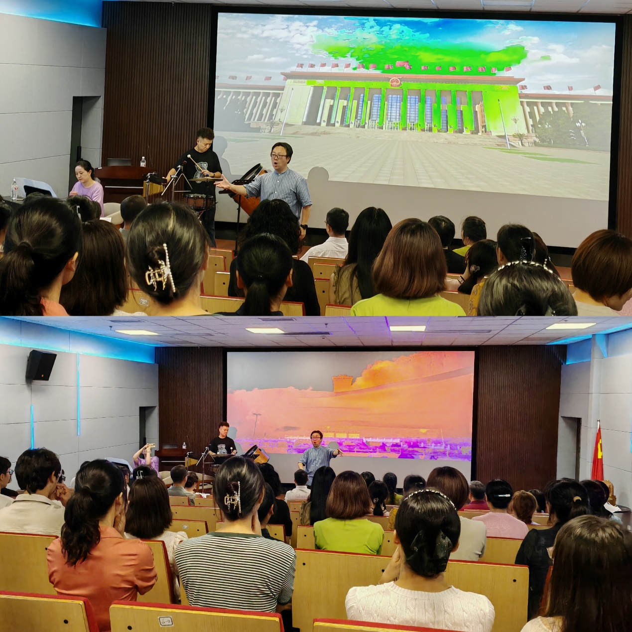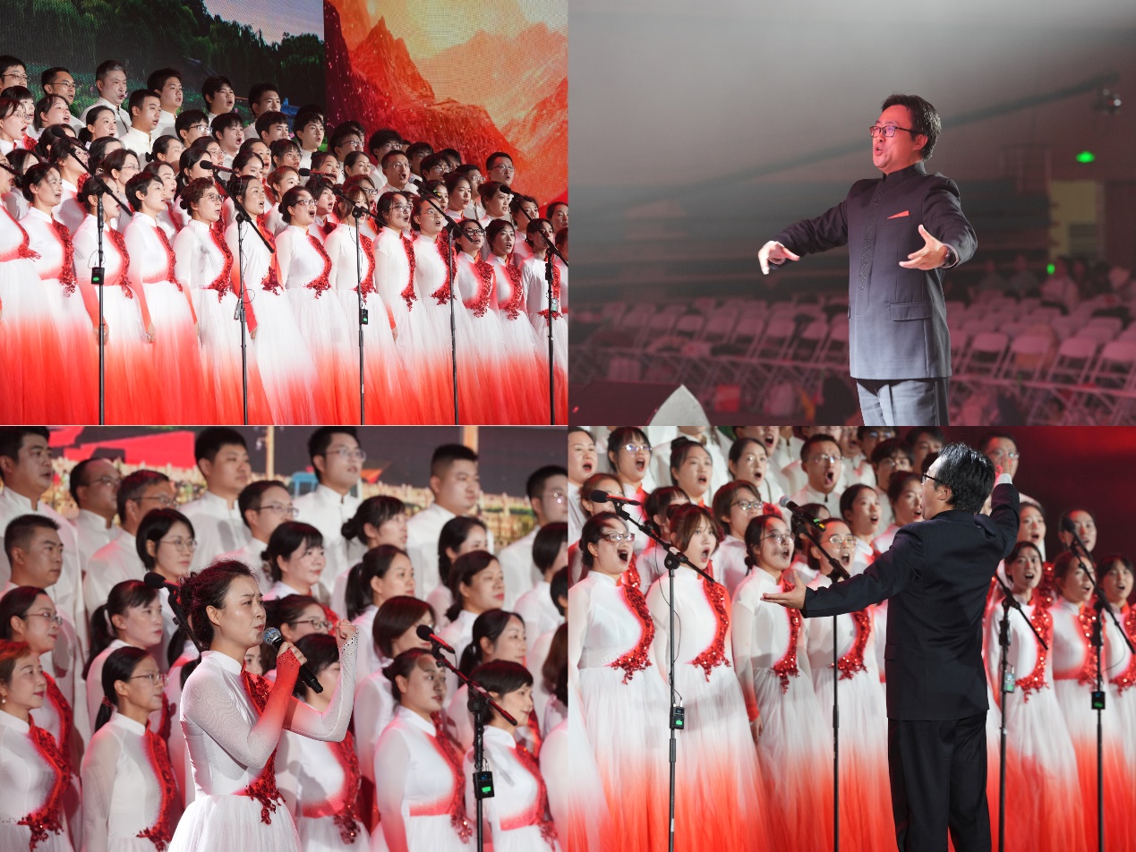 和图书馆师生们展现了对革命文化和社会主义先进文化的自觉弘扬,对祖国的无比热爱和衷心祝愿,以及对中华民族伟大复兴的使命担当。比赛现场,在甘霖老师大开大合的统一指挥下,钢琴伴奏王彦力老师与打击乐赵思智老师鼓乐和鸣、默契配合;领诵王洋老师和领唱蒋楠老师字正腔圆、声情并茂;合唱团师生们以饱满的激情和昂扬的精神完美地演绎了参赛作品《领航》,“伟大的中国共产党,乘风破浪扬帆远航,领航中国在新时代的征程上......”雄壮铿锵的歌声气贯长虹,不仅抒发了对党和祖国的深情厚谊,也展现了新时代交大师生的精神风貌和团结的力量,更是一堂深刻的“动人心、入人心”的艺术思政课。