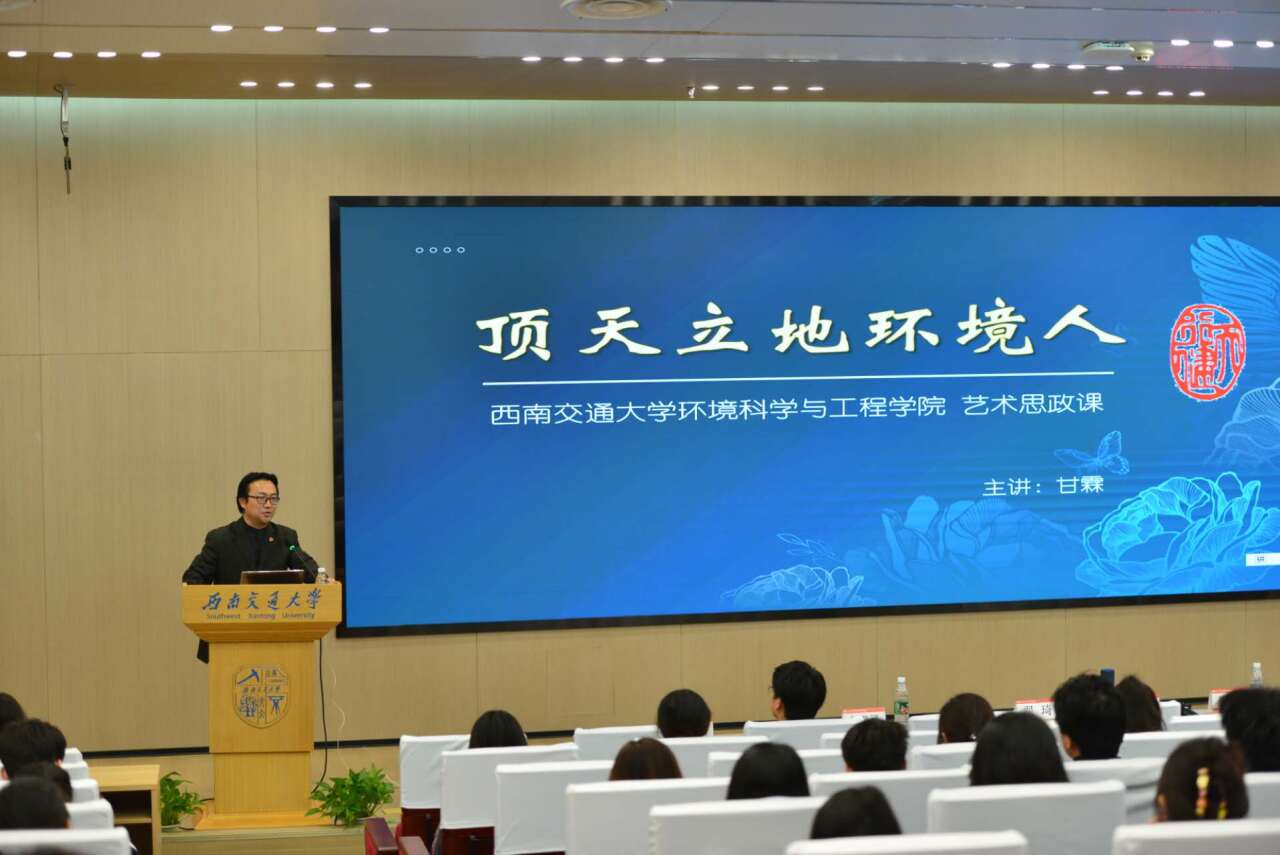 甘霖从交大环境人的初心和使命出发,为同学们上了一堂动人心、入人心的思政课。他表示,广大环境学子不仅要保护空气中的气、水、土,更要涵养自己内心的浩然之气、上善之水、厚德之土。这是一堂形式丰富的艺术思政课:既有直抒胸臆的朗诵,又有引吭高歌的乐曲;既有中华英雄的榜样故事,又有传统文化的诗词名句。他将一个个篇章、一个个故事结合起来,为学生展现了如何成为一个顶天立地环境人。他在最后向全场同学发出五问,同学们用整齐划一、掷地有声的声音喊出:“我是中国人、我是交大人、我爱中国共产党、我爱我的祖国、我爱环境学科!”