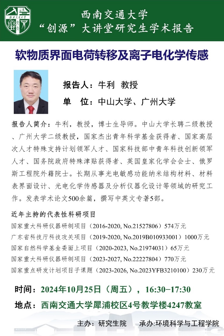 ,在犀浦校区X4247作题为“软物质界面电荷转移及离子电化学传感”的学术报告。