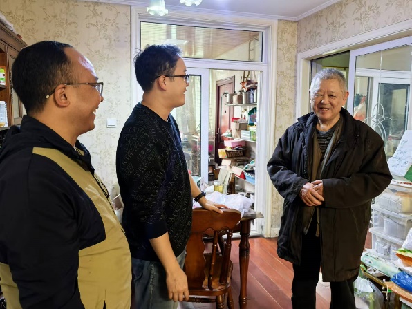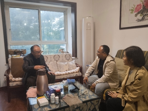 在走访慰问的过程中,与退休老师促膝交谈,仔细询问老同志们的身体及生活情况,热情地一起聊起家常。退休教师们与来访老师分享自己的退休生活,气氛温馨融洽。同时,走访老师向老教师们汇报学院发展近况,并积极听取他们对学科发展和教书育人的经验与建议。