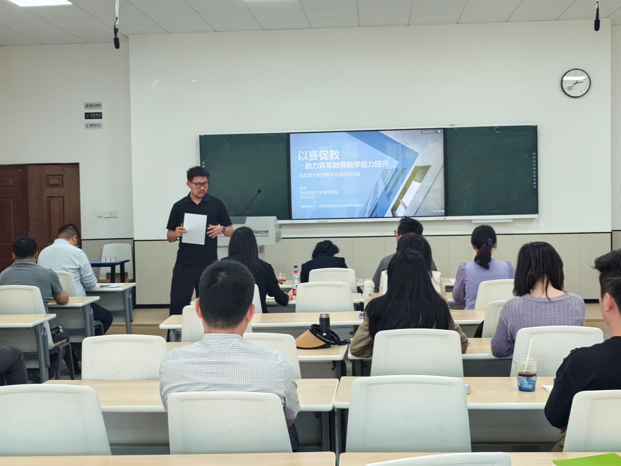 在X4247会议室隆重举行教学研讨会暨青年教师教学竞赛启动会。会议由甘霖书记致欢迎辞、赵锐副院长主持,聚焦“深化教学改革、提升育人质量”主题,特邀四川省“四有”好老师,外国语学院党委书记李成坚教授、全国青教赛一等奖获得者,建筑学院宣湟副教授作专题分享,全院教职工集体参加学习。