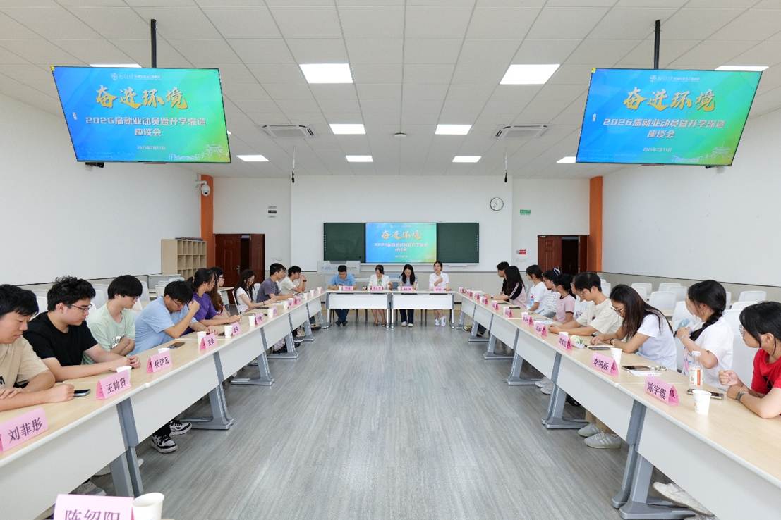 成功举办了2026届就业动员暨升学深造座谈会,旨在为有升学意向的学生提供更加细致、有针对性的指导与帮助,助力同学们实现升学深造目标。学院院长龚正君教授、青年教师龚新颖副教授、曾卓副教授、辅导员翟琦、曾祥珂与2026届拟升学学生面对面畅谈职业发展规划。