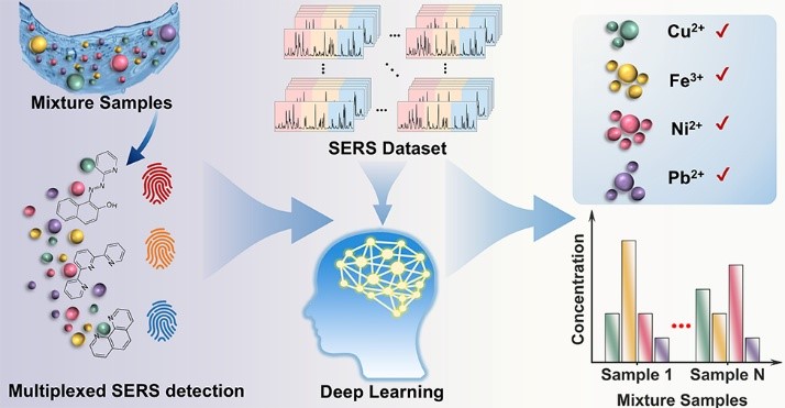 硕士研究生李樊同学在《Environmental Science & Technology》发表论文“AI-Enhanced SERS with Probe Combinations for Concurrent Identification and Quantification of Coexisting Metal Ions in Water”,通讯作者为龚正君教授和范美坤教授。本文提出“探针组合 + AI 解码”的 SERS 体系:在 PAN、TPY、Phen 三探针的多通道响应上进行全谱采集,构建高维SERS“超级指纹”,再以引入自注意力的深度学习模型端到端学习“全谱→浓度”的映射,专门针对谱线重叠与基质干扰。方法不依赖某一种超强选择性配体,而是利用多配体、全谱信息的细微差异来提升可分辨性与稳健性。该工作解决了现场快速同时定性定量测定水体中多种重金属的难题。