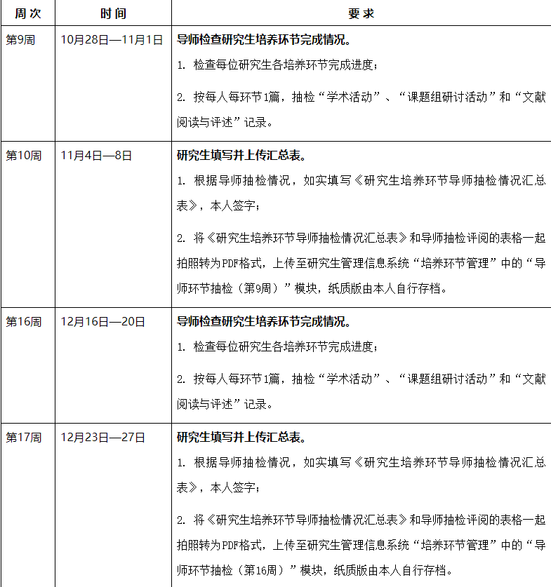 为了做好对研究生培养过程管理的质量督导,保障研究生培养过程质量,按照《红桃视频 研究生培养过程管理与质量督导实施办法 》要求,每学期第 9 周和第 16 周为“导师抽检周”, 每学期第 11 周和第 18 周为“抽检归档周”。本学期抽检对象为2023级和2024级所有研究生(含留学生),具体工作安排如下表,请各系室导师按照时间及要求进行培养环节的抽检和归档工作。