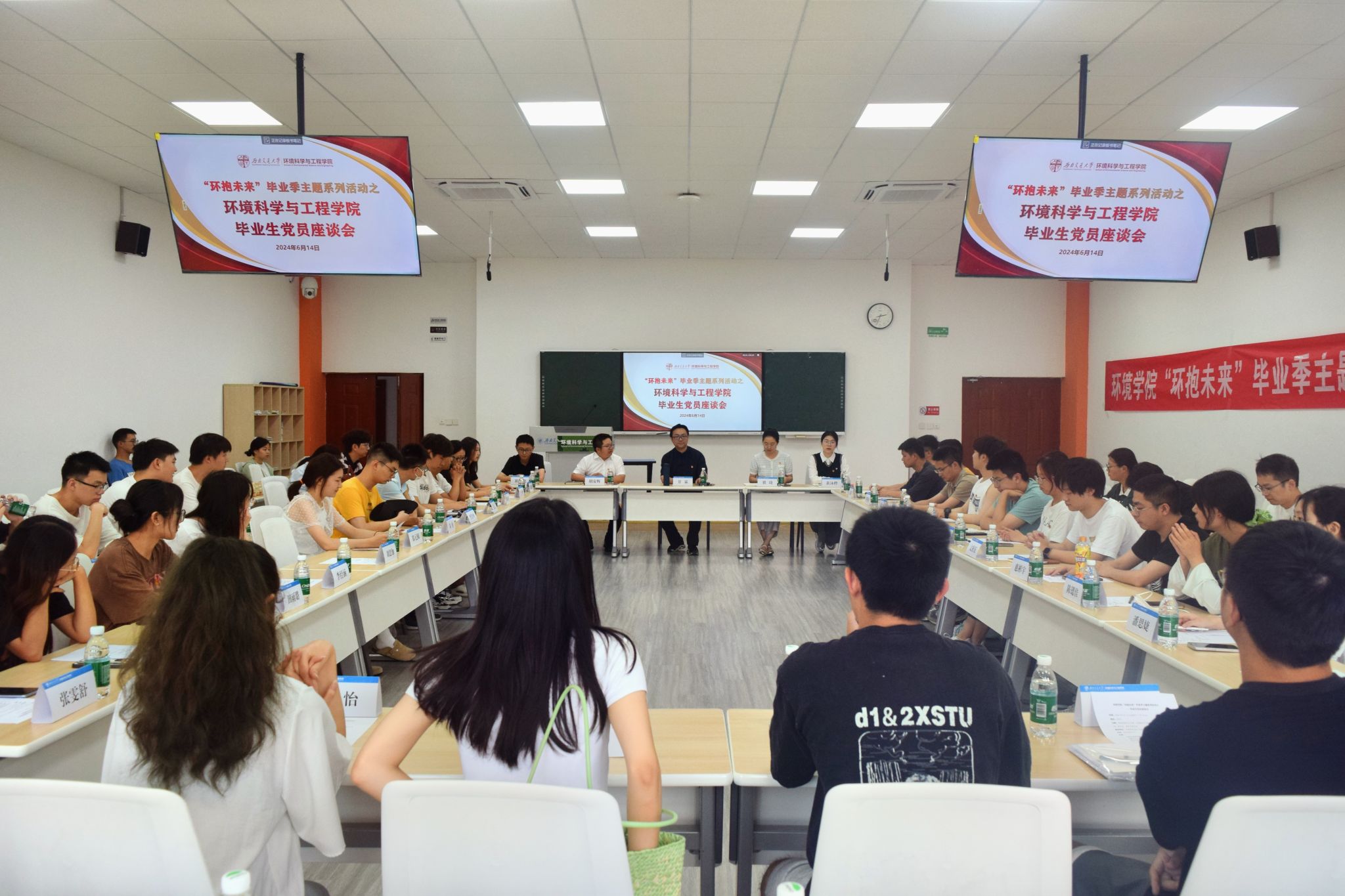 于X4247举行“环抱未来”毕业季主题系列活动之毕业生党员座谈会,学院党委书记甘霖,党委副书记胡安辉,毕业生辅导员翟琦、崔宇龙,辅导员黄泳桦及全体毕业生党员代表参加。
